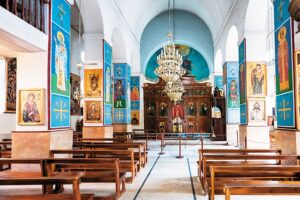 Madaba, the ‘City of Mosaics’, stands perched on an archaeological site with more than 4,000 years of history buried beneath it. The quality and quantity of mosaic flooring has made Madaba one of the most prominent cities in the world for mosaics. St. George’s Church houses the world-famous mosaic floor depicting a large mosaic map of Palestine. Centrally located on this mosaic floor is a detailed map of Jerusalem as it was during the sixth century AD. At the Church of the Apostles, at the southern entrance of the city, is a mosaic floor attributed to the craftsman Salamanios, depicting the sea, with the central figure of a woman encircled with a selection of creatures, vegetation and an inscription.